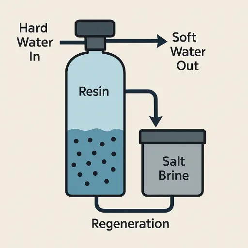 Su yumuşatma sistemlerinin temelinde iyon değiştirme prensibi yatar. Sertlik oluşturan kalsiyum ve magnezyum iyonları, güçlü asidik katyonik reçinenin yüzeyindeki sodyum iyonları ile yer değiştirir. Böylece sertlik oluşturan mineraller reçine yatağına bağlanır ve su çıkışında sadece sodyum içeren yumuşak su elde edilir. Reçine doyma noktasına ulaştığında, sistem otomatik rejenerasyon moduna geçer: tuzlu su tankından (brine tank) çekilen konsantre sodyum klorür çözeltisi reçinenin üzerinden geçirilir, reçine yatağındaki kalsiyum ve magnezyum iyonları yerlerinden sökülür ve atık hattına gönderilir. Rejenerasyon bittiğinde reçine tekrar iyon değiştirme kapasitesine kavuşur ve döngü başa döner.